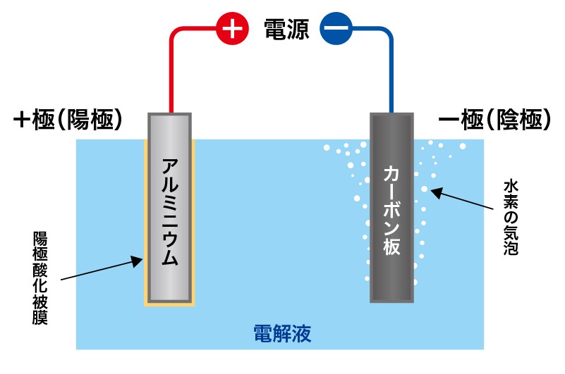 ・電流を流すことで陽極側に酸素が発生、製品表面が酸化
